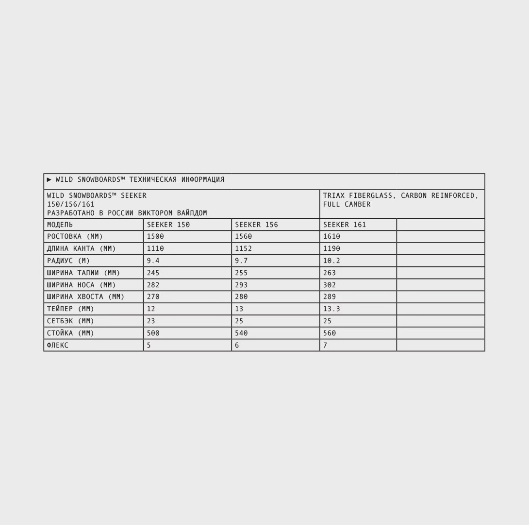 > SEEKER: Универсальная доска. От раннего сезонного паудера в Шерегеше и крутых поворотов в Кировске до экстремальных спусков в Сочи — где бы вы ни катались, Seeker укажет путь. Полный кембер с улучшенной поддержкой и оптимальной длиной носа и хвоста обеспечивает стабильность как на жестком склоне, так и в глубоком снегу.