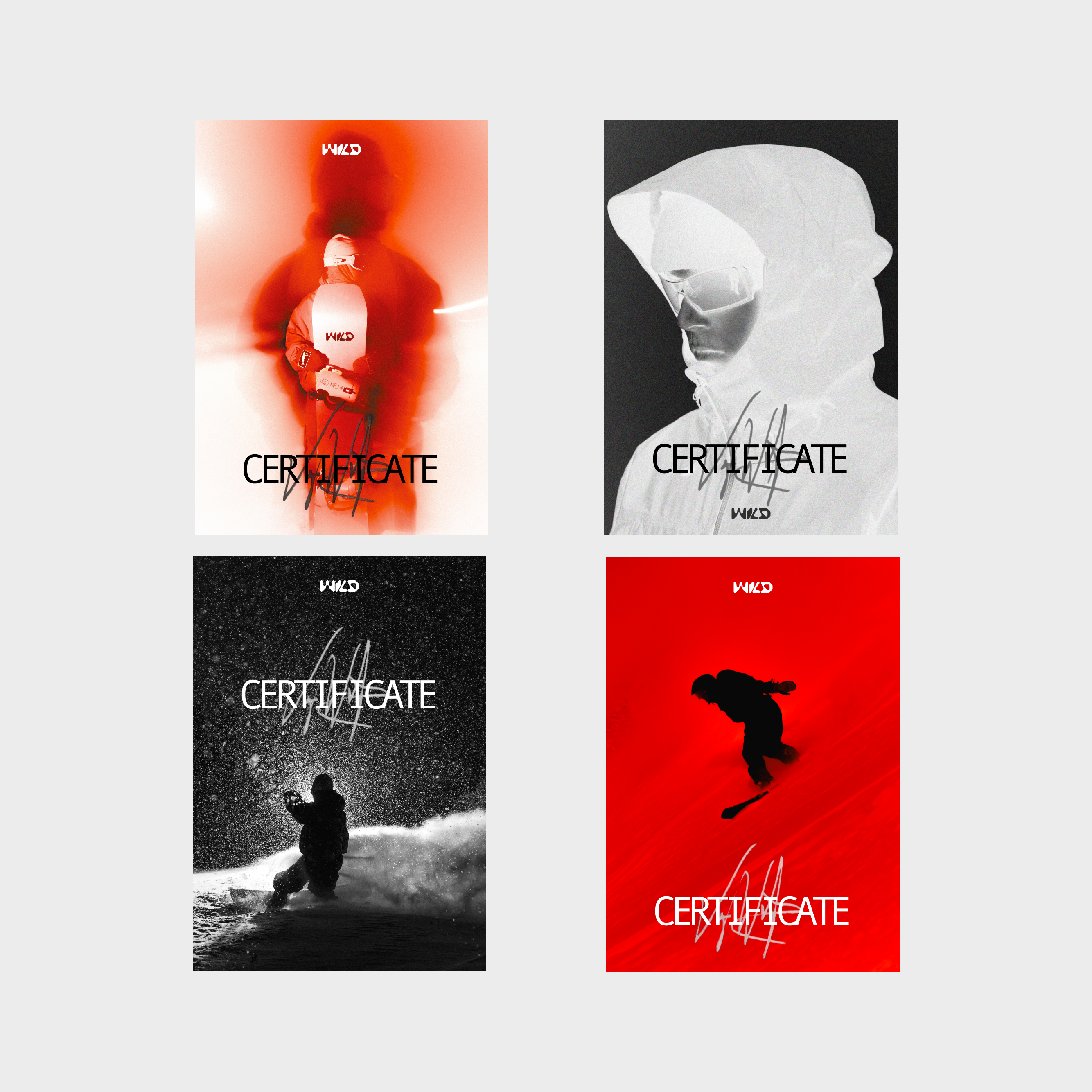Для оформления сертификатов мы использовали работы нашего фотографа Дмитрия Николаи. В коллекции представлено пять разных дизайнов с уникальными кадрами из жизни команды WILD: от динамичных спусков до атмосферных моментов.