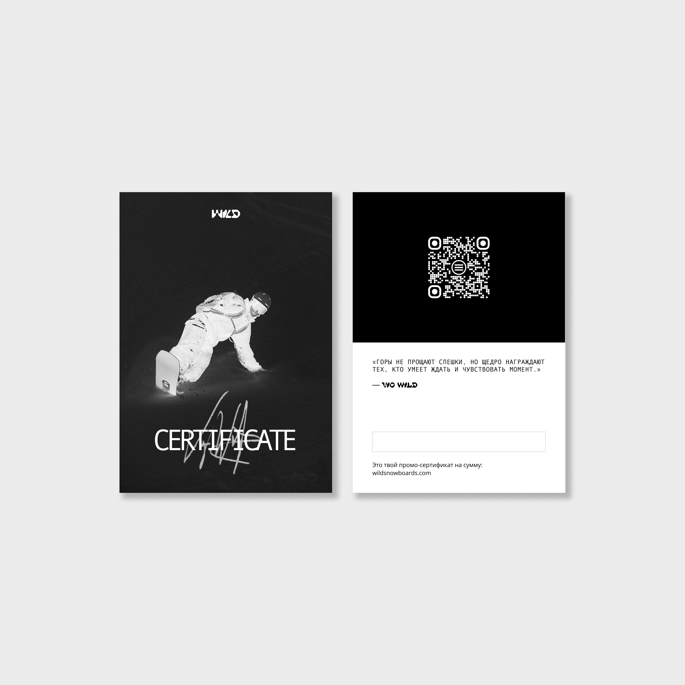 Подарочный сертификат с уникальным промокодом на указанную сумму. Активируется при оформлении заказа на сайте wildsnowboards.com и действует на весь ассортимент бренда — сноуборды, одежду, аксессуары и мерч.